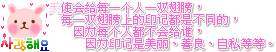 原帖由 忧伤☆囧公主 于 2010-7-25 11:27 发表 这样的。 要: 天使会给每一个人一双翅膀,每一双翅膀上的印记都是不同的,因为每个人都不会给谁, 因为印记是美丽、善良、自私等 ...