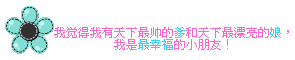 原帖由 温暖如斯。 于 2010-7-27 19:42 发表 楼主还接吗 字:我觉得我有天下最帅的爹和天下最漂亮的娘,我是最幸福的小朋友! 其他的随便 分分刷了补