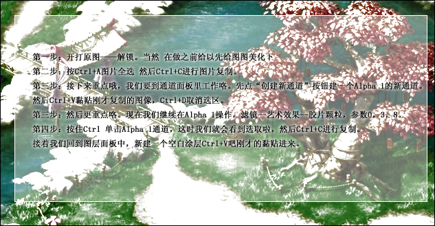 第三步:然后更重点咯。现在我们继续在Alpha 1操作,滤镜—艺术效果—胶片颗粒,参数0,3,8。