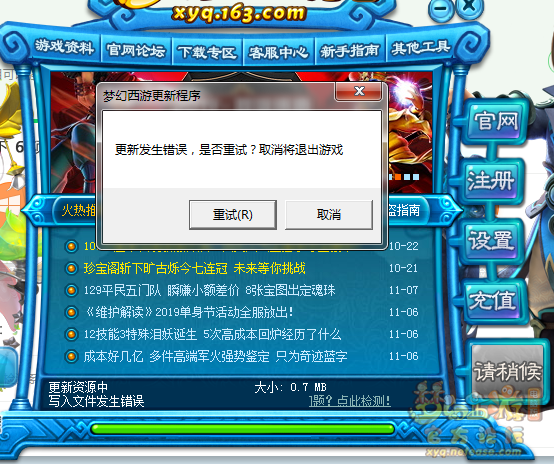 进测试服需要更新时,写入文件失败了。 想在官网补丁下载那下测试服的补丁,但是,找不到。