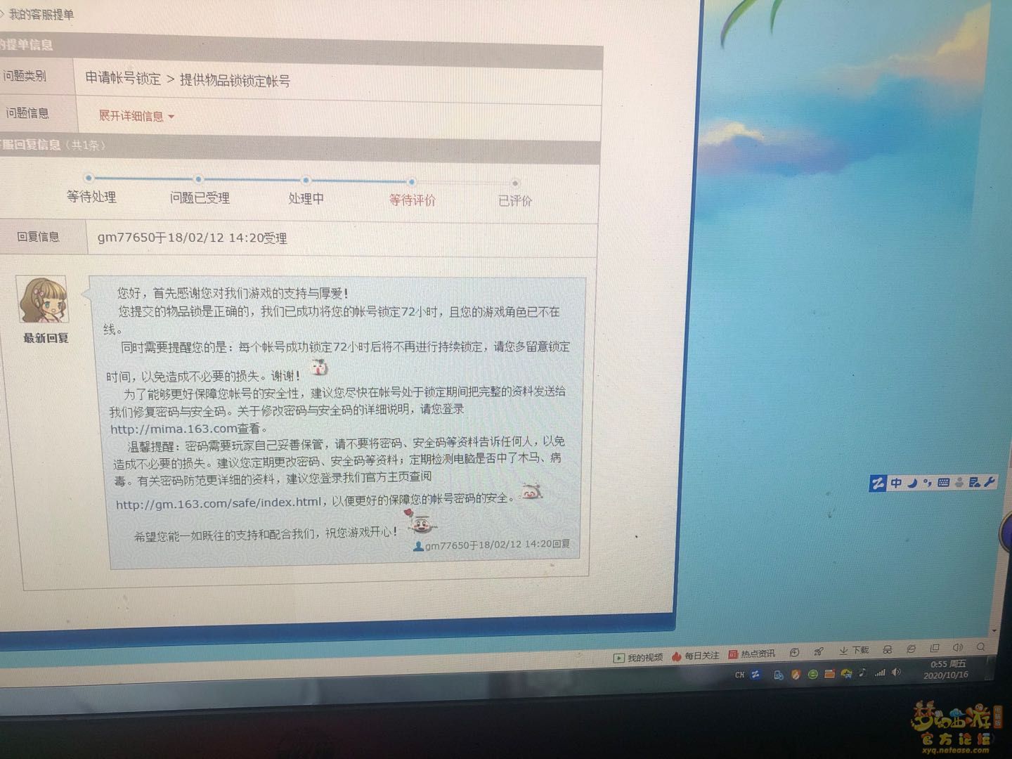 账号是2018年2月被封停的已经过了两年多了,求求工作人员了真的跟我没关系帮我解封吧,事情的经过是这样的:我是找游戏内的朋友帮助我玩一下,我宝宝忘记加锁,被他卖了,我找回以后,买我宝宝的人给我举报了,官方 ...