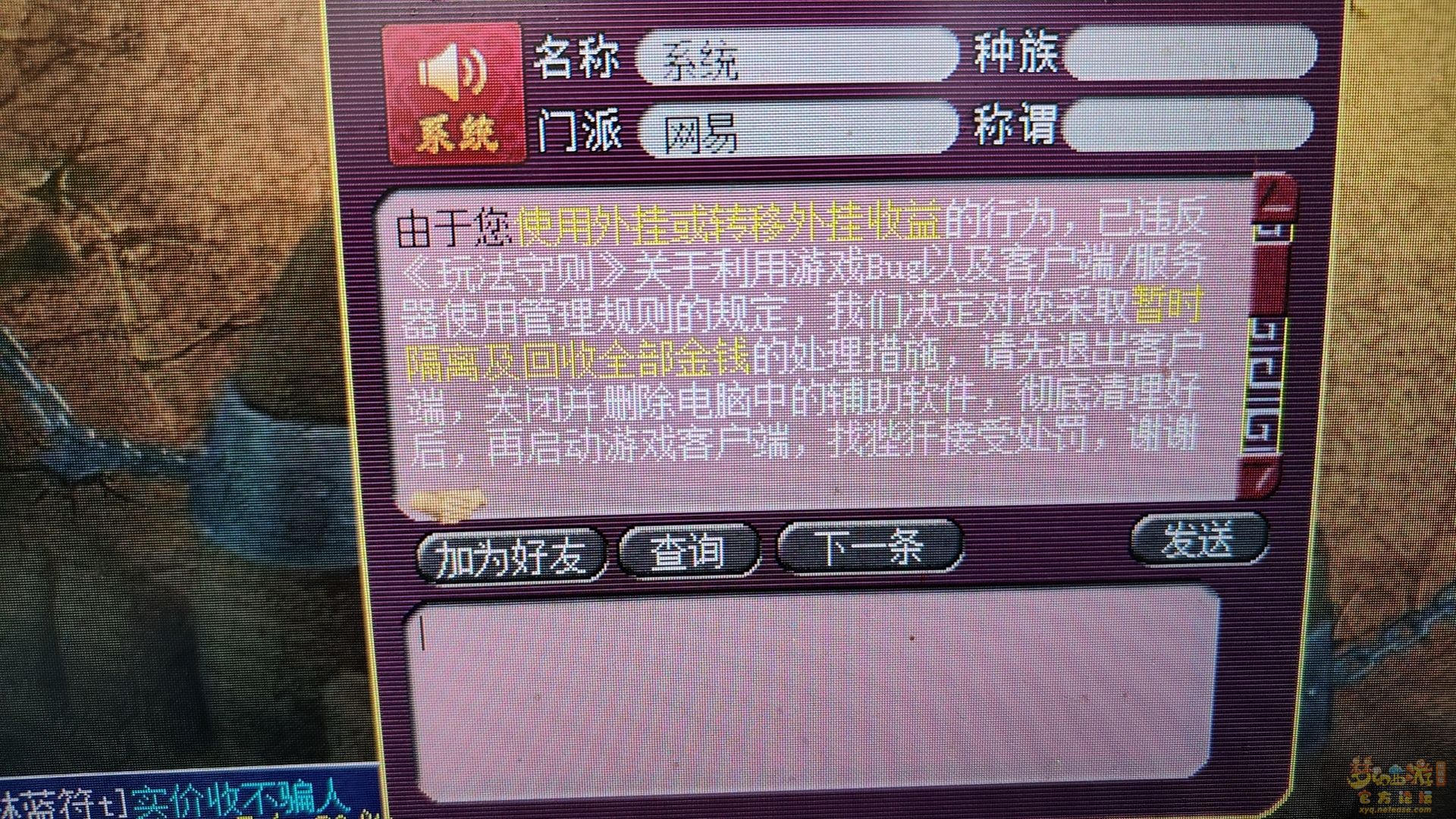 | 你这个还能登录游戏? 我那是直接封号禁止登录,那些说开外挂的就别扯了,莫名其妙的就封号,没经历过的不懂 |