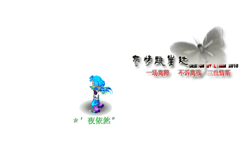 原帖由 花、点点丶 于 2010-4-26 18:11 发表 瓦也要瓦也要 签签 ~~~ 名字 :花"点点 称谓 :落迦玄女 人物 :蛾子 黑头 紫翅膀 蓝衣服 武器 :青藤玉树 (侧面的哦) 背景 :地府的桥上 ,旁边加个超级泡泡 大字 :輪迴 小字 :下一丗 ...