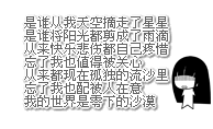 原帖由 荼毒. 于 2010-8-3 15:45 发表 占。 是谁从我天空摘走了星星 是谁将阳光都剪成了雨滴 从来快乐悲伤都自己疼惜 忘了我也值得被关心 从来都现在孤独的 ...