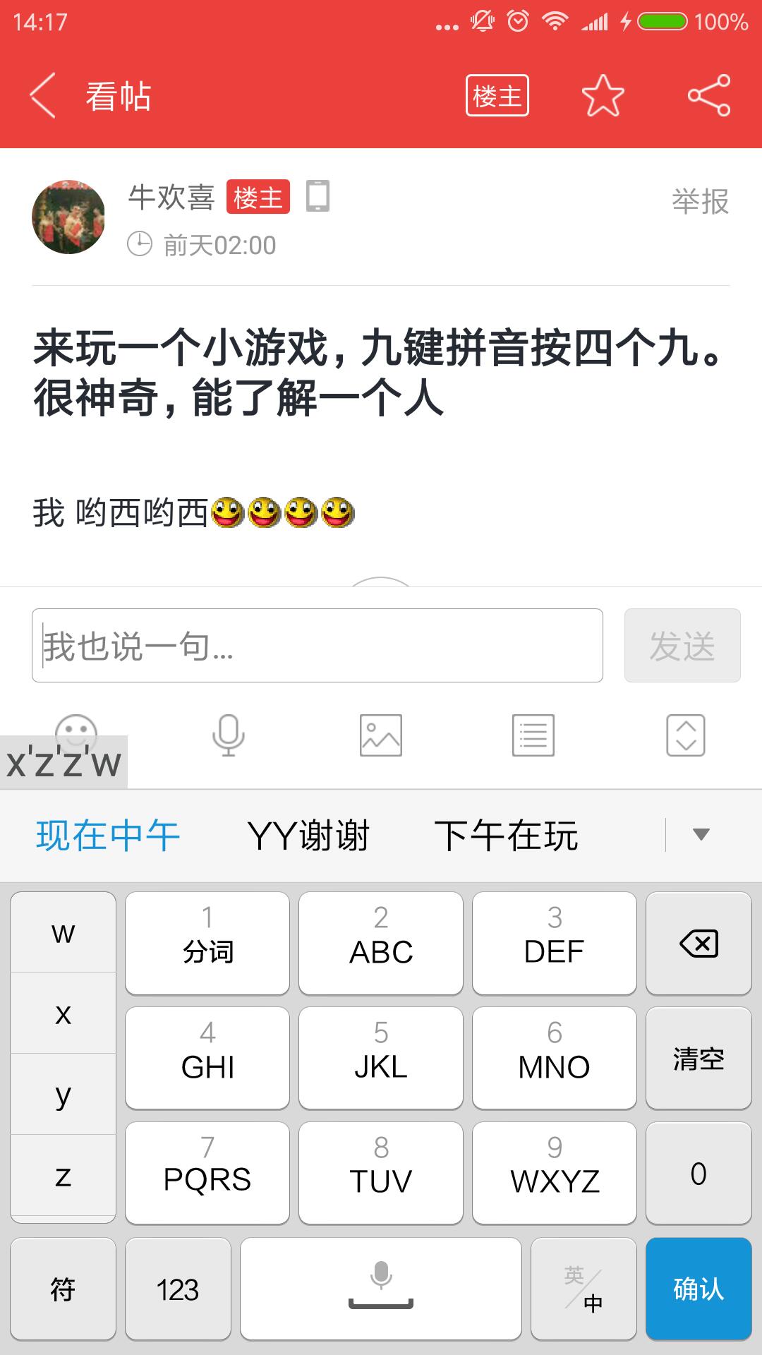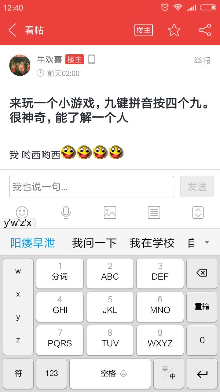 来玩一个小游戏,九键拼音按四个九。很神奇,能了解一个人