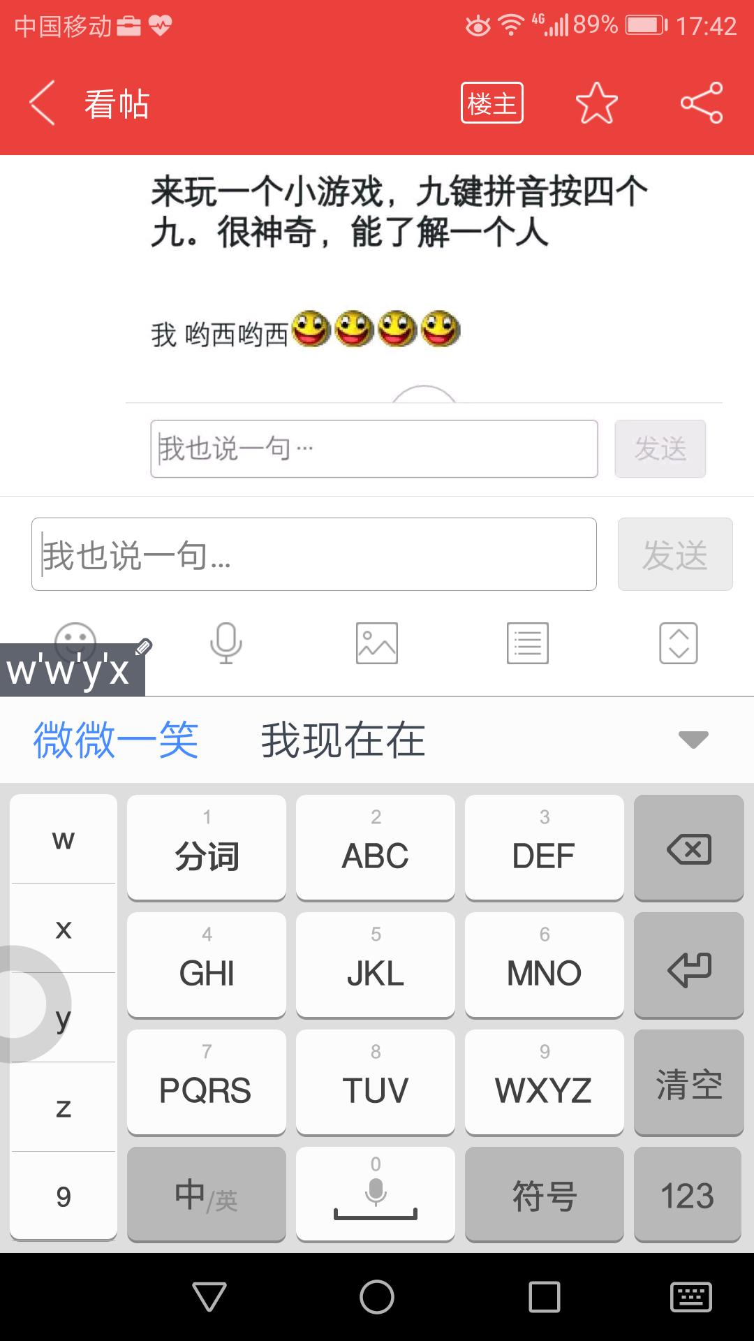 来玩一个小游戏,九键拼音按四个九。很神奇,能了解一个人