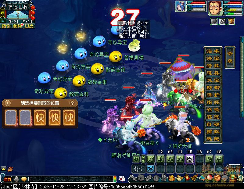 最后,在刷环任务途中大家有几率遇见奇遇任务。每名少侠每天最多可从10次奇遇环任务中获得奖励,奇遇环任务中将有小概率出现“幸运果精”闯入怪物,击败幸运果精后,队内5名玩家都将获得1个“梦晶石” 。