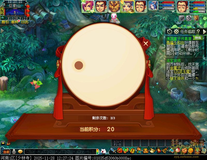 接下来遇到善福小和尚,完成一个敲鼓小玩法,到达50分后,可以直接右上角关闭游戏。