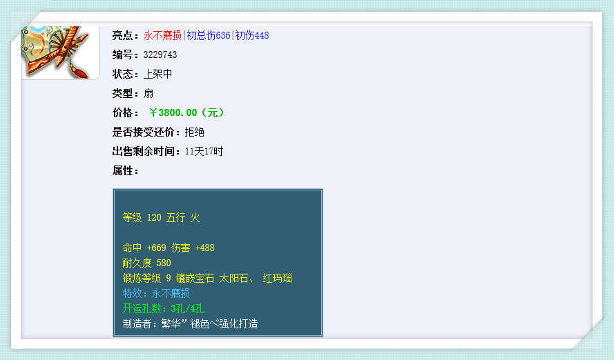 藏宝阁中,同类型的扇子,也是不便宜的,玩家的这把武器还是能卖点钱的。虽然129级的耐久不是很贵,但是架不住仙族疯狂的耐久使用玩法,肯定还是一把不磨在手有备无患。