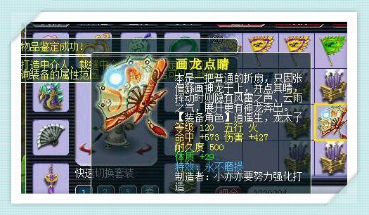玩家没想到还真的鉴定出蓝字了!这把120级的扇子,初始命中573,初始伤害427,命中属性挺不错的,爆了122点,伤害爆了39点。目前的初始总伤害618,这个初始伤害还算不错,单加了29点体质还是很有用的,对于大多数的玩家来说,应该是没有玩家会嫌弃自己的血量多。如果打了12锻的红玛瑙的话,总伤害718点,在129级中也是还算不错的。