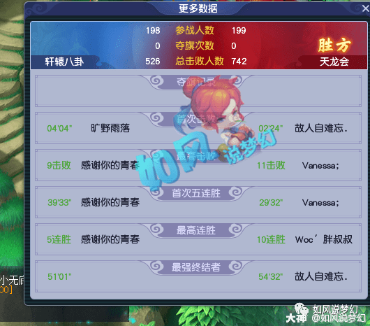 无独有偶,除了阳光城之外,钱塘江区内帮战的竞争也达到了白热化的程度。一场周日的夺旗大战中,轩辕八卦有198人参战,天龙会有199人参战,整个地图密密麻麻全是人,想想都让人热血沸腾! 最终上届联赛第4的天龙会,击杀人数达到了742人,赢下了最后的比赛! 109老板238万买无级别破血男头
