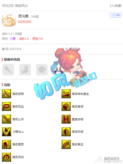 昨日,有一只攻击资质1601,防御资质1589,成长高达1.3的力劈+壁垒混沌兽,在藏宝阁以20万元的价格被秒杀。如此个性的宝宝,真的是非常罕见!