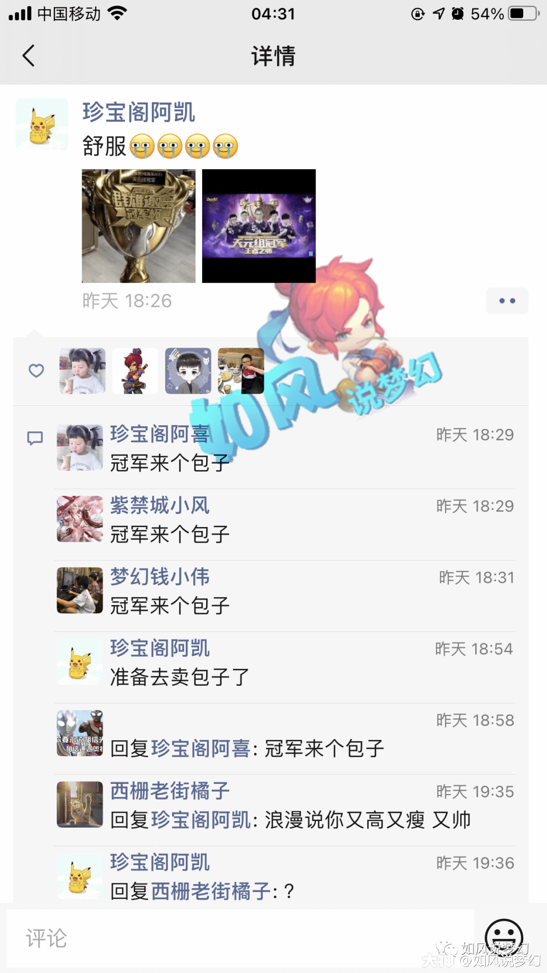 在拿下第一届“群雄冠军杯”冠军之后,珍宝阁指挥阿凯在朋友圈秀出了超大的奖杯,引来了无数圈内好友的点赞留言。小伙伴们,你们觉得这个奖杯的造型怎么样?
