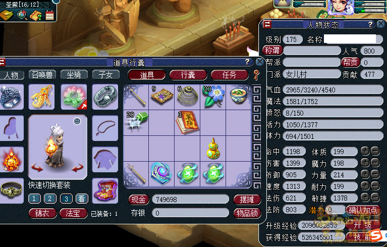 我这个女儿是最后一个化圣的,强壮和神速都还没怎么弄,我自己觉得现在还可以了,不用经常换属性。 你新弄的号先玩一段时间看看再调吧,我也是后来调的 |