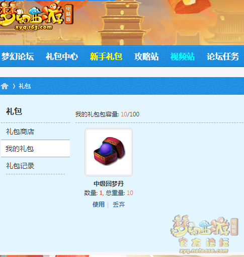 点击使用会获得一个序列号~ 在游戏里礼包中心,官方活动的回梦丹那里使用该序列号,就可以获得一个回梦丹~ 获得以后,在有效期内使用该丹就可以了~ |