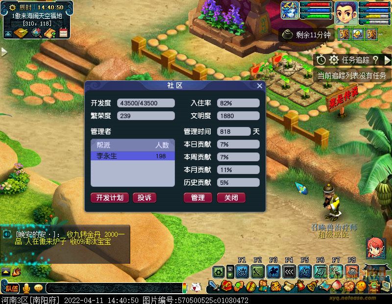 【时间】2022年04月14日星期四 【作者】李永生,河南省南阳市 【内容】我们的帮派于2018年创建,现在已经五年时间了,做为帮派的管理者,非常重视“管辖社区”!因为拥有了社区管理权,我们帮派的成员,除了跑商获 ...