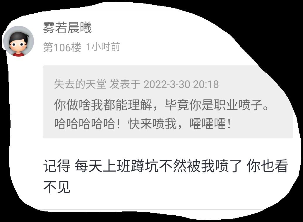 雾若晨曦 发表于 2022-3-31 09:36 记得 每天上班蹲坑 不然被我喷了 你也看不见