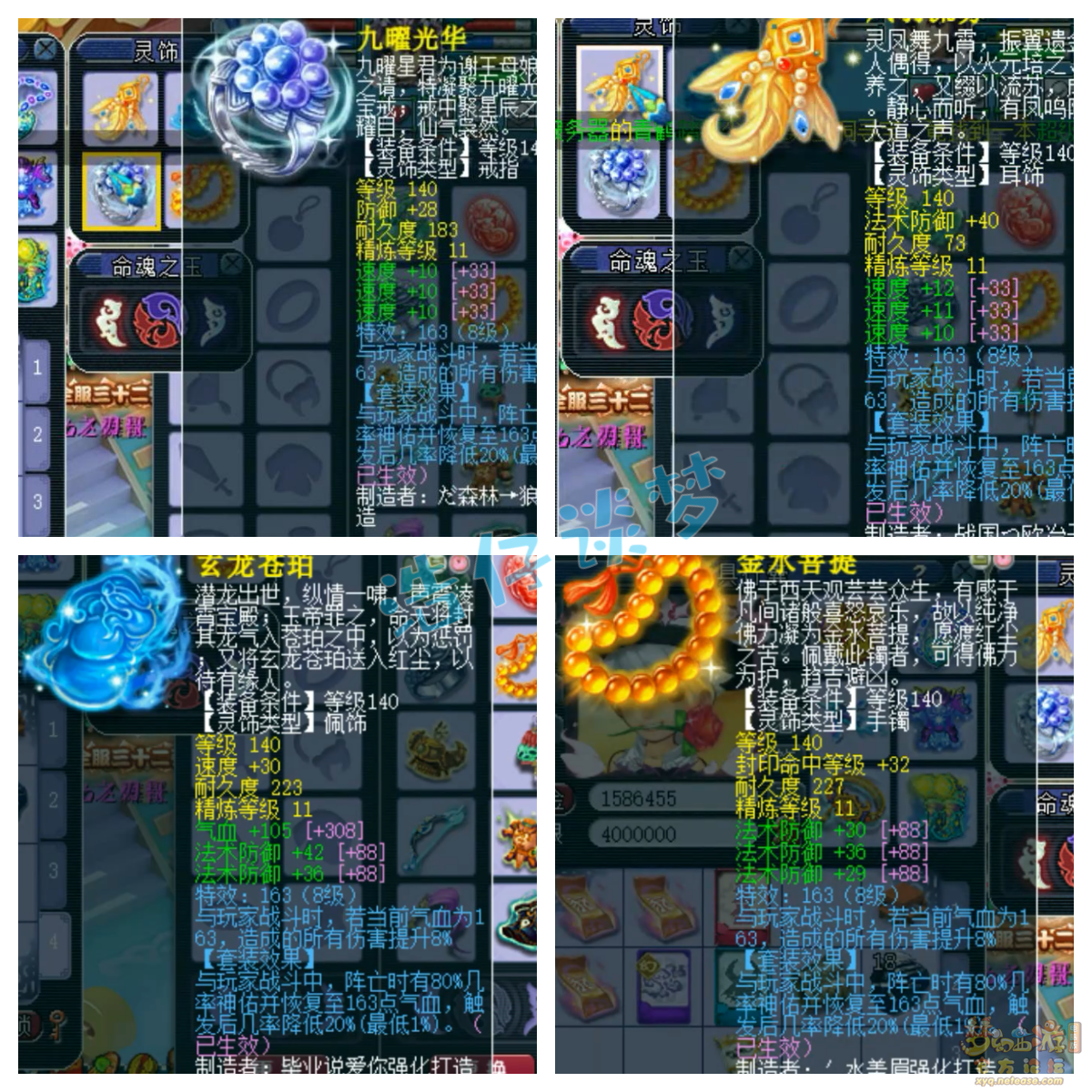 戒指和耳饰下排都是三速度,配饰下排双法防一气血,手镯下排三法防,全部打了11锻星辉石,特效都是8级163。