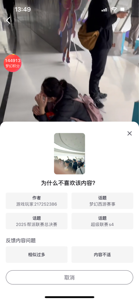 我都让搞晕了,能不能让屏蔽的玩家,不在刷到这些账号,能不能让屏蔽理由是相似内容过多的用户也不要在刷到类似的视频了?